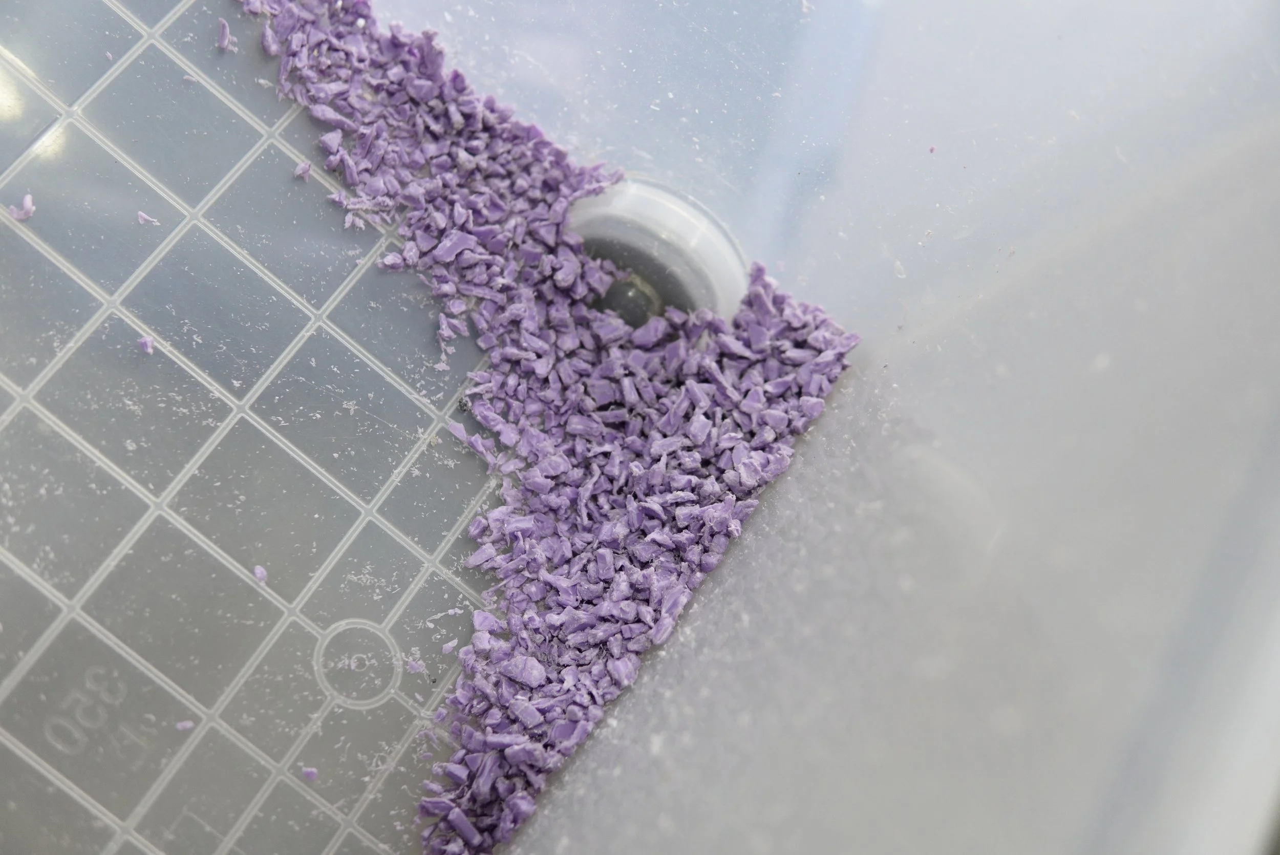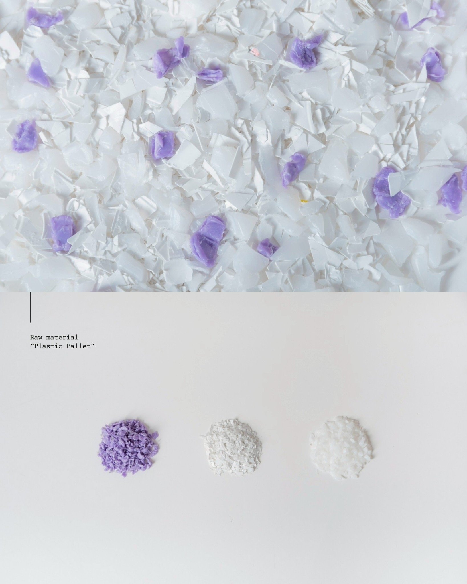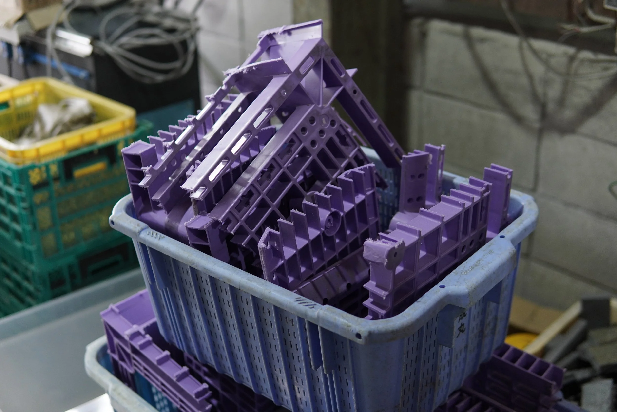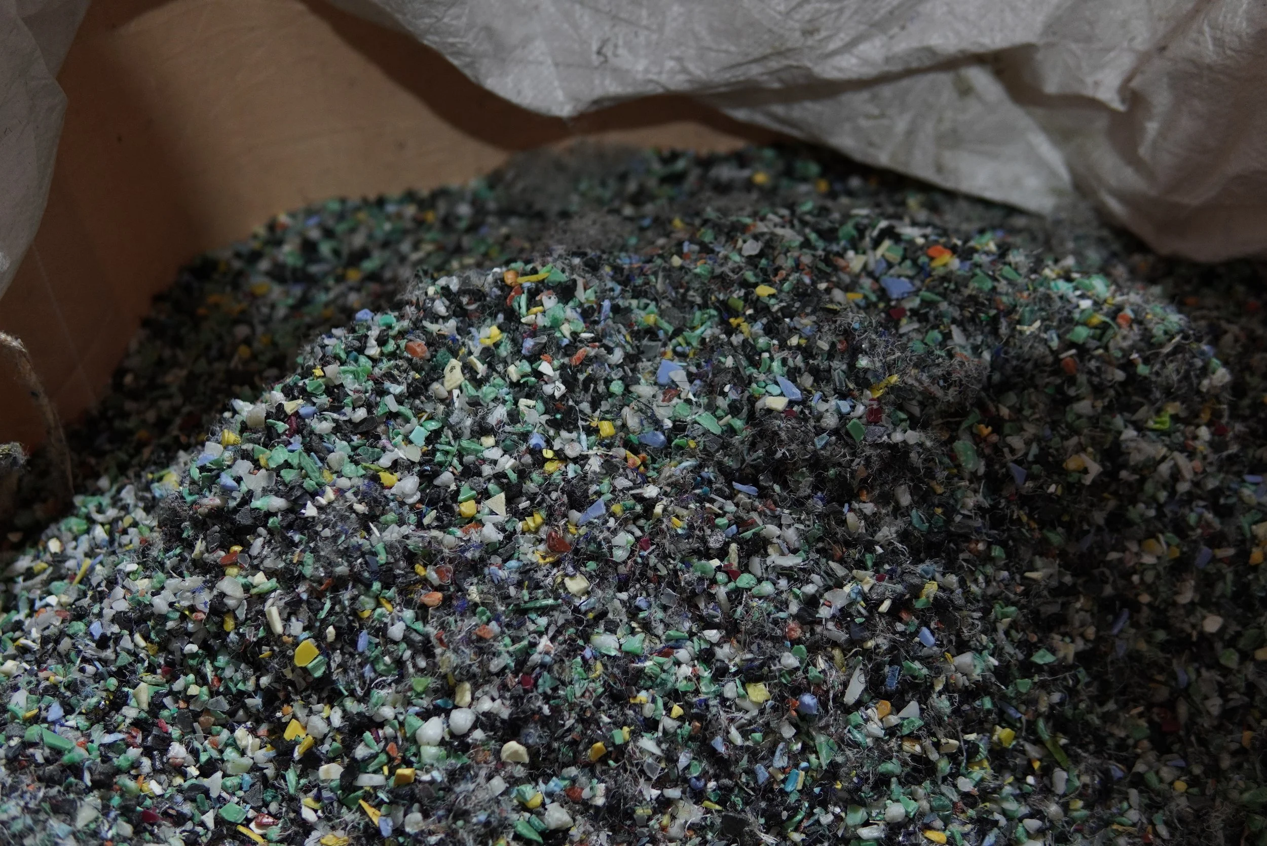 工場内にある色とりどりの廃棄プラスチックでオリジナルの配色を考え